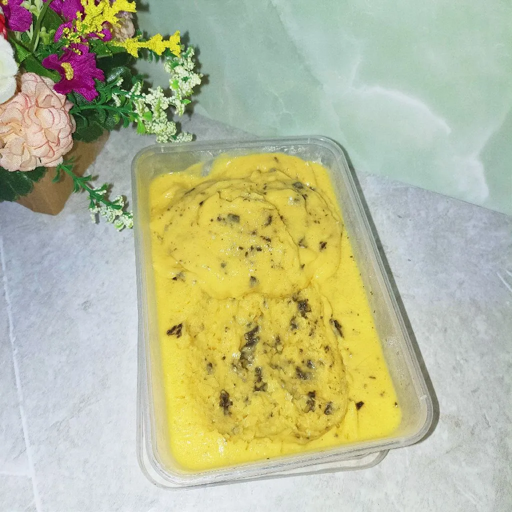 Es krim homemade sehat berbahan dasar labu kuning, manis gurih dengan tambahan potongan cokelat yang lumer di mulut. Teksturnya yang lembut, cocok bua