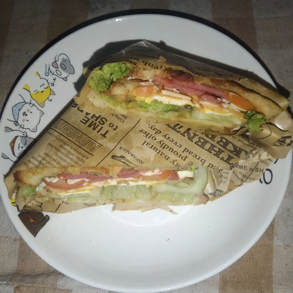 Tata kembali dengan roti yang diolesi saus, telur, timun, selada, dan roti tawar.
